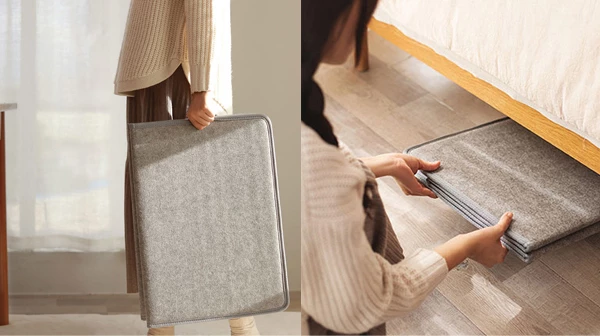 부피가 큰 온풍기와는 달리 M자로 접어 부담 없이 보관이 가능하며, 450g으로 매우 가벼워 여기저기 옮겨 다니며 쓰기 편리하다. (사무실이나, 집안 곳곳에서 쓰기 굿) 다리뿐만 아니라 등 뒤에도 놔두고 몸 전체를 따뜻하게 하기도 좋다.