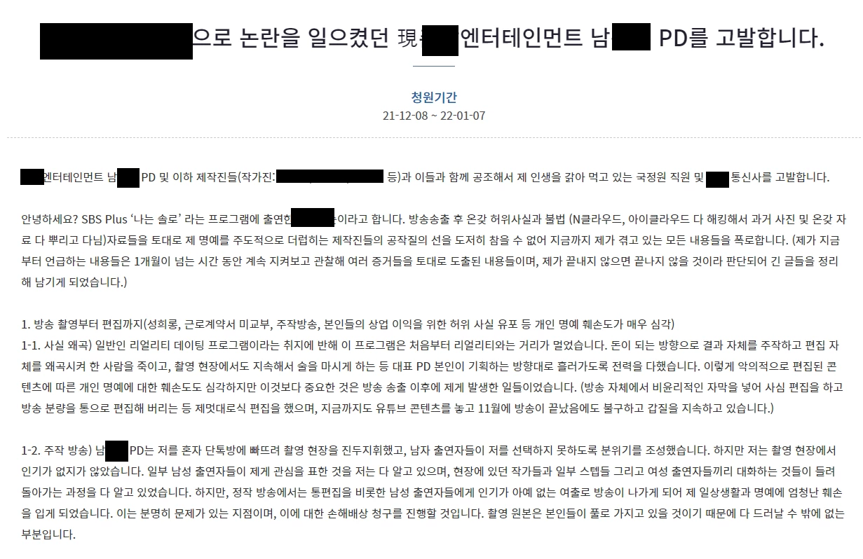 SBS 플러스·NQQ '나는 솔로' 여성 출연자라고 주장하는 A씨는 지난 8일 청와대 국민청원 게시판에 국정원과 해당 프로그램 제작진이 도청을 하고 있다는 내용의 글을 올렸다. 현재 해당 청원 글은 삭제된 상태다.