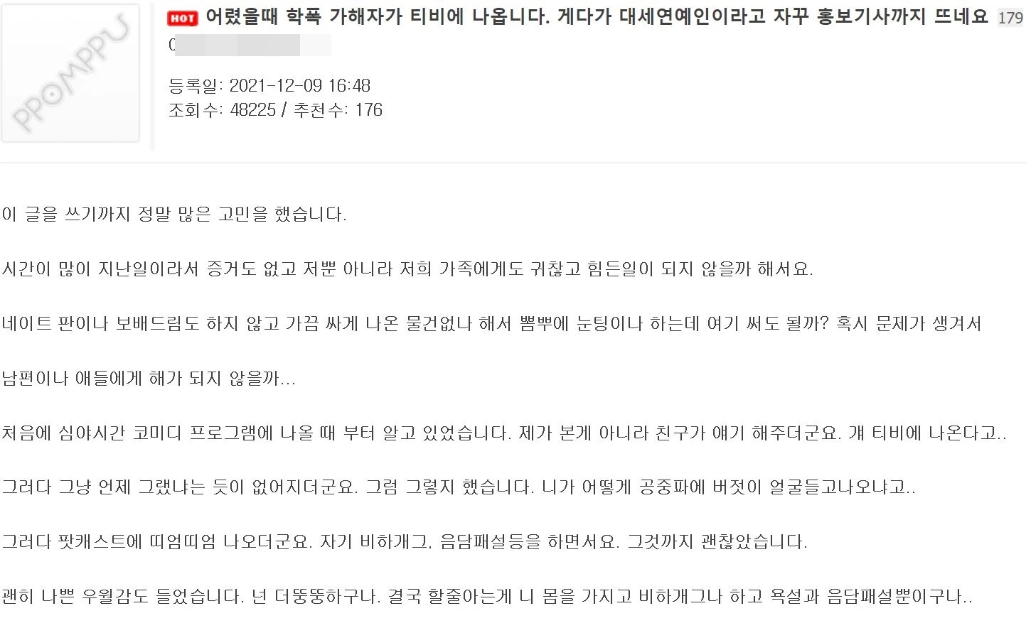 9일 온라인 커뮤니티 뽐뿌에는 "어렸을 때 학폭 가해자가 티비에 나옵니다. 게다가 대세 연예인이라고 자꾸 홍보 기사까지 뜨네요"라는 제목의 글이 올라왔다.