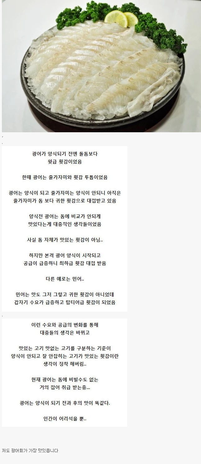 글 작성자는 "최상급으로 여겨지는 줄가자미만큼 광어도 상급의 횟감이었다"며 "광어가 양식되기 전에는 돌돔보다도 더 알아주는 생선이었다"고 말했다.