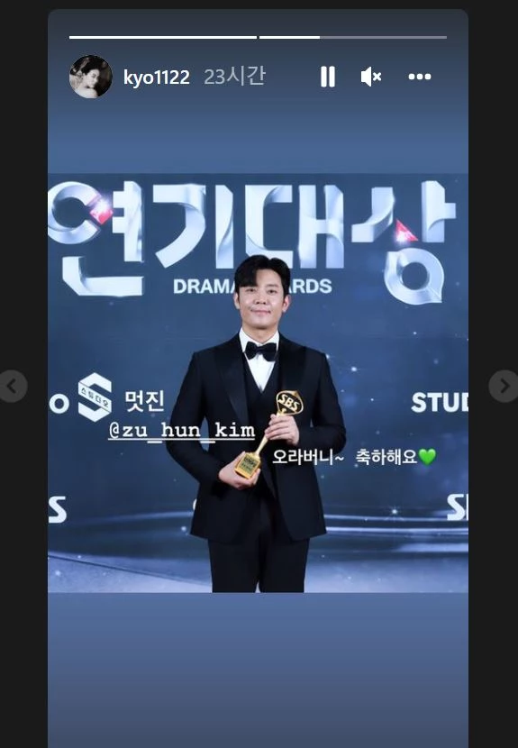 송혜교는 시상식에 오지 않았지만 보고는 있었다. 그는 같은 드라마에 출연한 배우들이 상을 받으면 사진을 찍어 인스타그램 스토리에 올렸다.