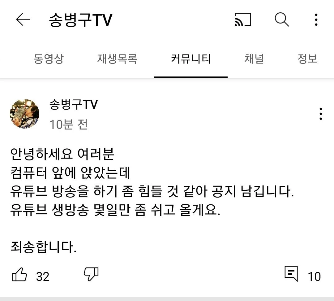 송병구는 큰 충격을 받은 것 같다. 그는 3일 유튜브 채널 송병구TV에 "컴퓨터 앞에 앉았는데 유튜브 방송을 하기 좀 힘들 것 같아 공지 남긴다. 유튜브 생방송 며칠만 좀 쉬고 오겠다. 죄송하다"라는 공지를 올렸다.