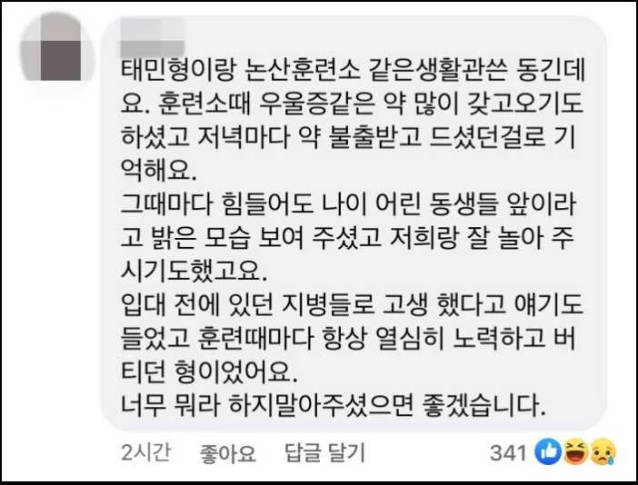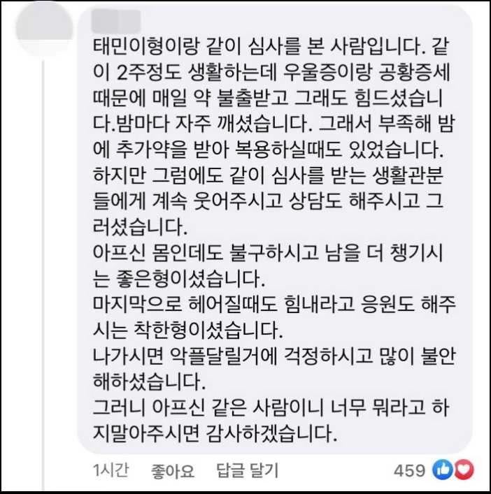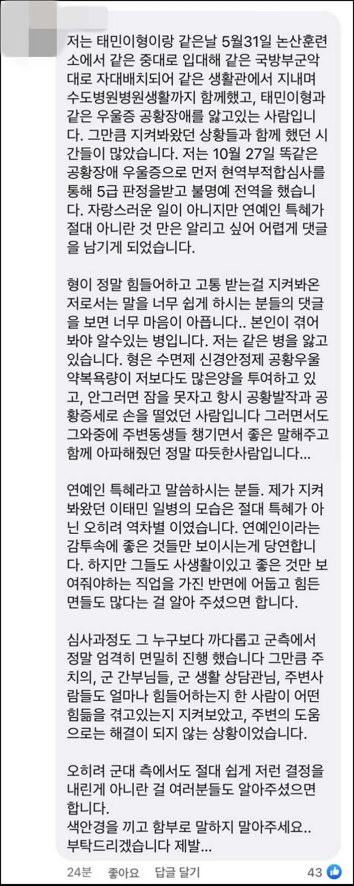 해당 네티즌들은 가계정이 아닌 실명과 프로필 사진 등을 밝힌 본계정으로 댓글을 남겼다. 그들은 군 생활 동안 태민을 옆에서 지켜본 지인의 입장에서 태민 보충역 편입 소식에 대한 생각을 밝혔다. 이들은 하나같이 태민의 성실하고 모범된 군 생활을 칭찬하며 연예인 특혜 등은 없었다고 말했다. 되려 태민 현재 상태를 걱정하며 악플 등은 자제해달라고 당부하기도 했다.