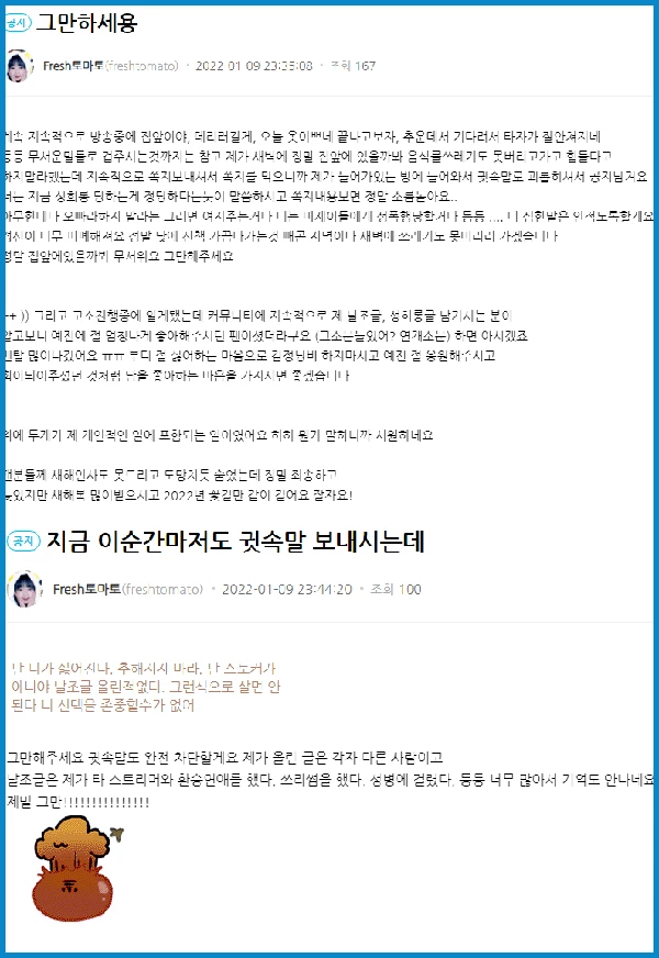 그러면서 토마토는 “그만해달라. 귓속말도 차단하겠다. 내가 다른 스트리머와 환승연애를 하고 쓰리섬을 했으며 성병에 걸렸다고 날조 글을 올리지 않았나. 너무 많아서 기억도 안 난다. 제발 그만해달라”고 했다.