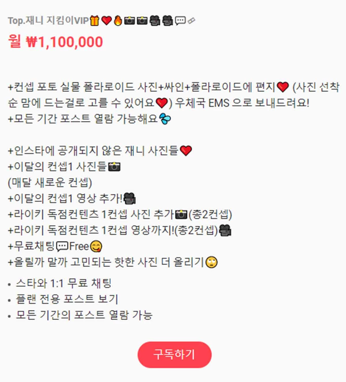 그러다 33만330원으로 구독료가 올라가면 ‘올릴까 말까 고민되는 핫한 사진’을 볼 수 있다고 신재은은 말한다. 60만5000원을 내면 무료로 신재은과 채팅을 할 수 있다. 가장 비싼 월 구독료는 110만원이다. 신재은은 이 서비스의 내용을 다음과 같이 밝힌다.
