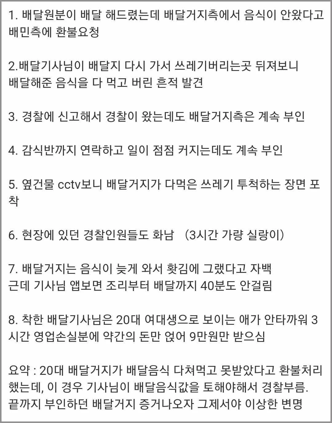 배달세상에 올라온 글에 따르면 배달원이 배달을 완료했음에도 음식 주문자인 여성이 음식이 오지 않았다면서 배달의민족에 환불을 요청했다. 분명히 음식을 배달했기에 의아함을 느낀 배달원이 배달지에 가서 쓰레기 버리는 곳을 뒤졌다. 배달 음식을 먹고 버린 흔적이 발견됐다.