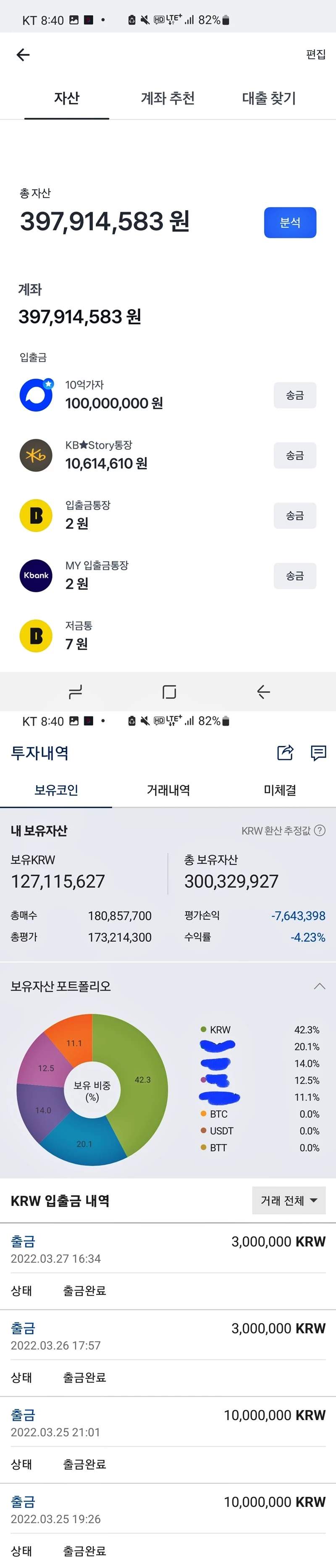 그는 "현재 토스뱅크, 케이뱅크 계좌에 4억 원 정도 현금 빼놓고, 업비트는 3억 원 기준으로 수익 나는 거 통장에 모으고 있어"라고 운을 뗐다.