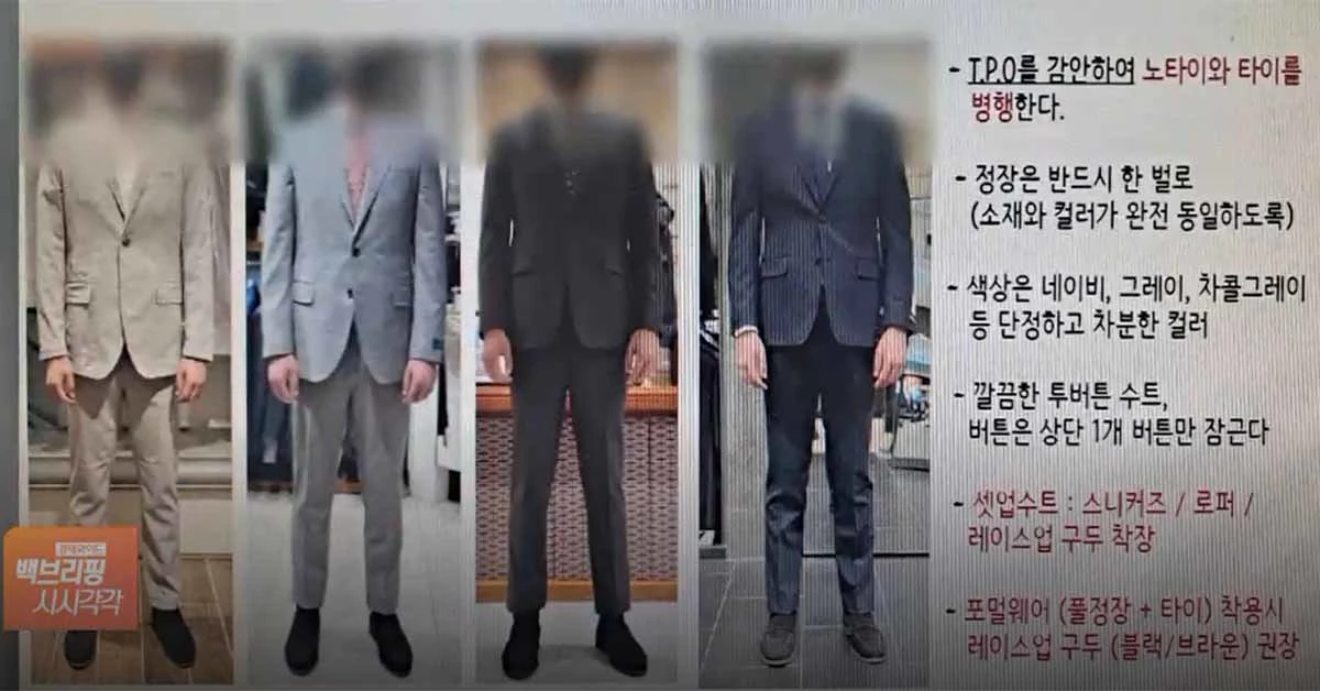 남성의 경우 정장은 네이비 그레이 차콜그레이 등 단정하고 차분한 컬러의 투버튼 수트 한 벌로 입어야 한다. 또 버튼은 상단 1개를 반드시 잠가야 한다.