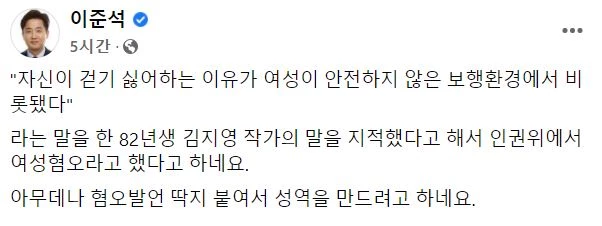 2일 이 대표는 페이스북에 "'82년생 김지영' 작가의 말을 지적했다고 해서 인권위가 나를 여성혐오라고 했다고 한다"라고 운을 뗐다.