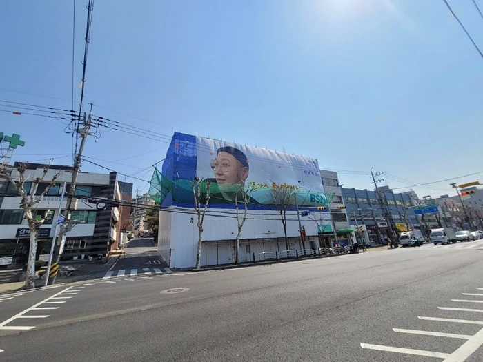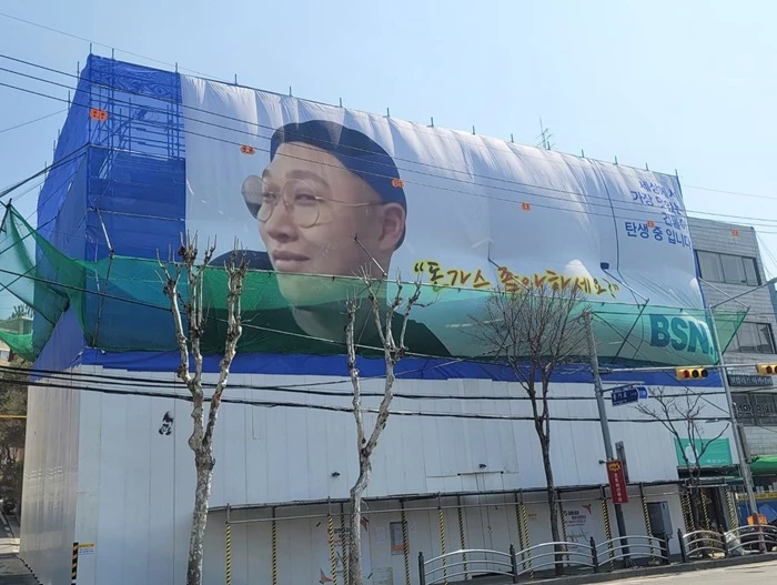 리모델링 공사 중인 해당 건물에는 스윙스의 얼굴이 꽉 찬 현수막이 걸려 눈길을 붙잡았다.