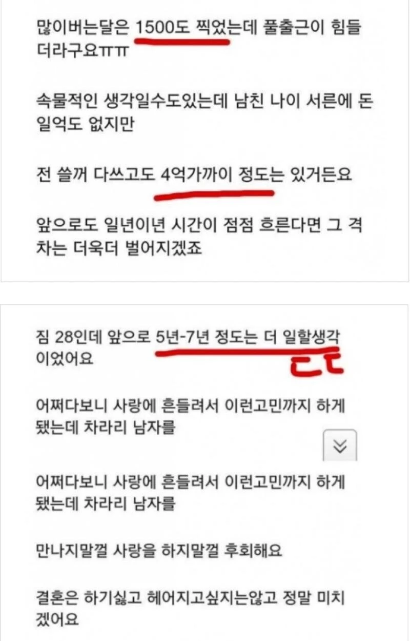 A씨는 "차라리 (다른 남자) 스폰(스폰서) 첩으로 살면 살았지 도저히 (300만원을) 쪼개서 살아갈 자신이 없다"며 "남친을 만나지 말 걸, 사랑을 하지 말 걸 후회된다"고 토로했다.