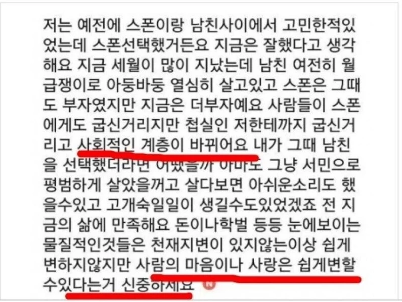 A씨와 똑같은 갈등을 겪었다는 이 여성은 자신이 남친을 버리고 스폰서를 잡아 '사회적 계층이 바뀌었다'고 만족해했다.