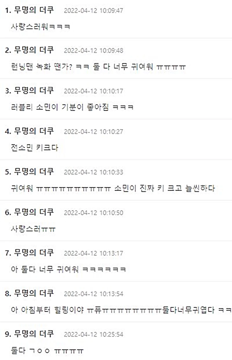 이 사진을 런닝맨 시청자들에게 관심을 끌며 12일 더쿠 등 주요 커뮤니티로도 확산했다. 네티즌들은 전소민의 밝은 미소를 보면 절로 기분이 좋아진다며 엄지 척을 날렸다. 또 전소민의 키가 생각보다 커서 놀랐고 늘씬한 몸매도 매력적이라는 반응이 이어졌다.