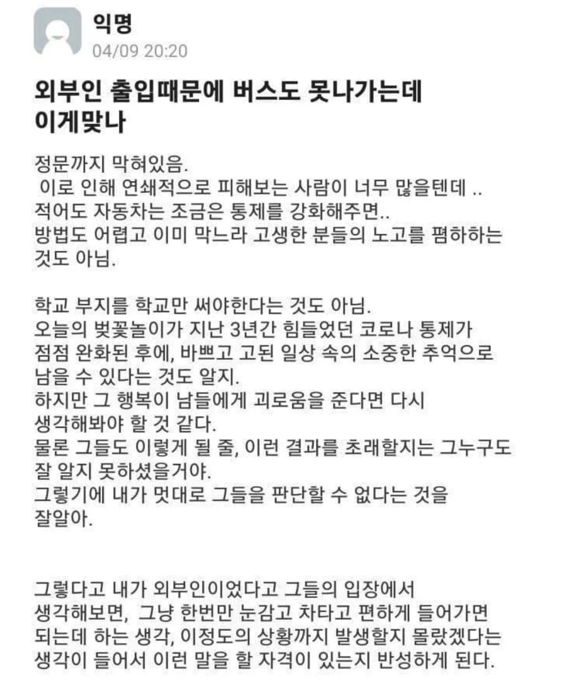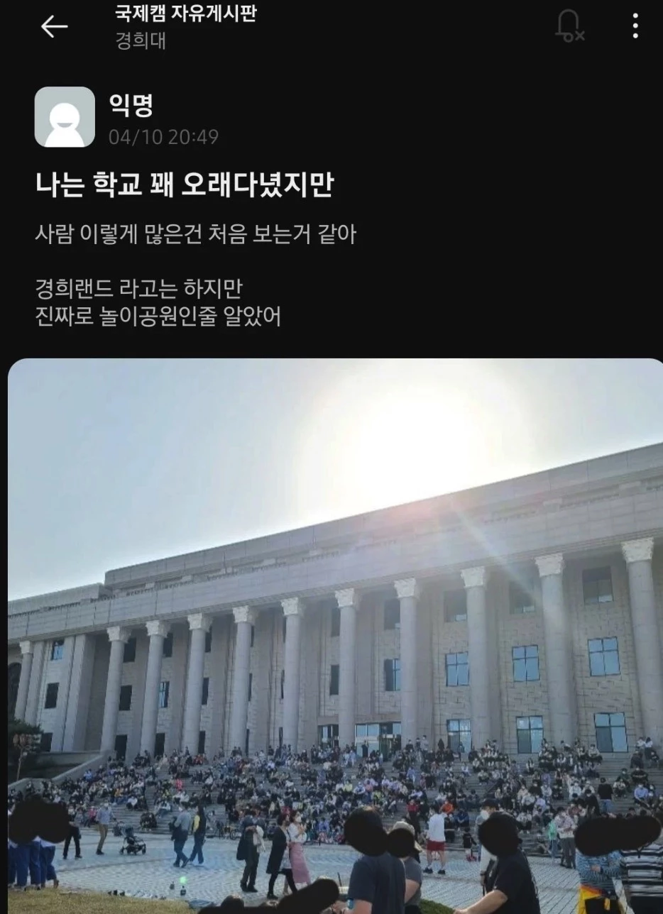 지난 10일 경희대 에브리타임에는 학생들이 벚꽃놀이를 보러 온 사람들 때문에 피해를 입었다는 글들이 올라왔다.