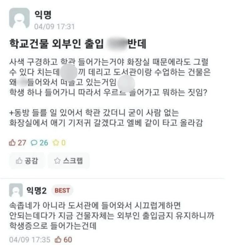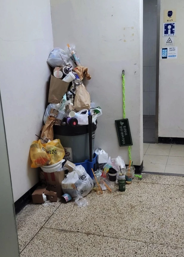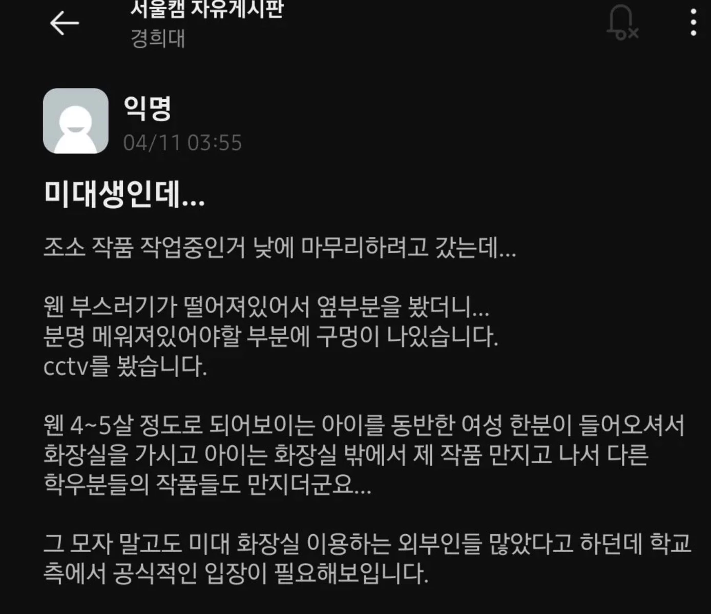 또 다른 학생은 “미대생인데 조소 작품 마무리하려고 갔는데 부서져 있더라. CCTV 돌려보니 4~5살 정도로 보이는 아이를 동반한 여성분이 작품을 만지더라. 화장실에 쓰레기도 엄청 버리셨다. 학교 측이 통제 좀 했으면 좋겠다”며 글과 사진을 올렸다.