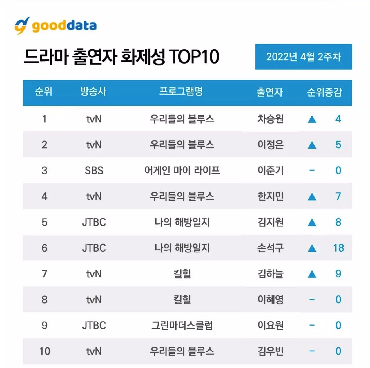 굿데이터 코퍼레이션이 5일 발표한 4월 2주차 드라마 TV 화제성에서 1위는 ‘우리들의 블루스’가 차지했다. 이어서 ‘나의 해방일지’, ‘어게인 마이 라이프’, ‘내일’ 등이 뒤를 이었다.