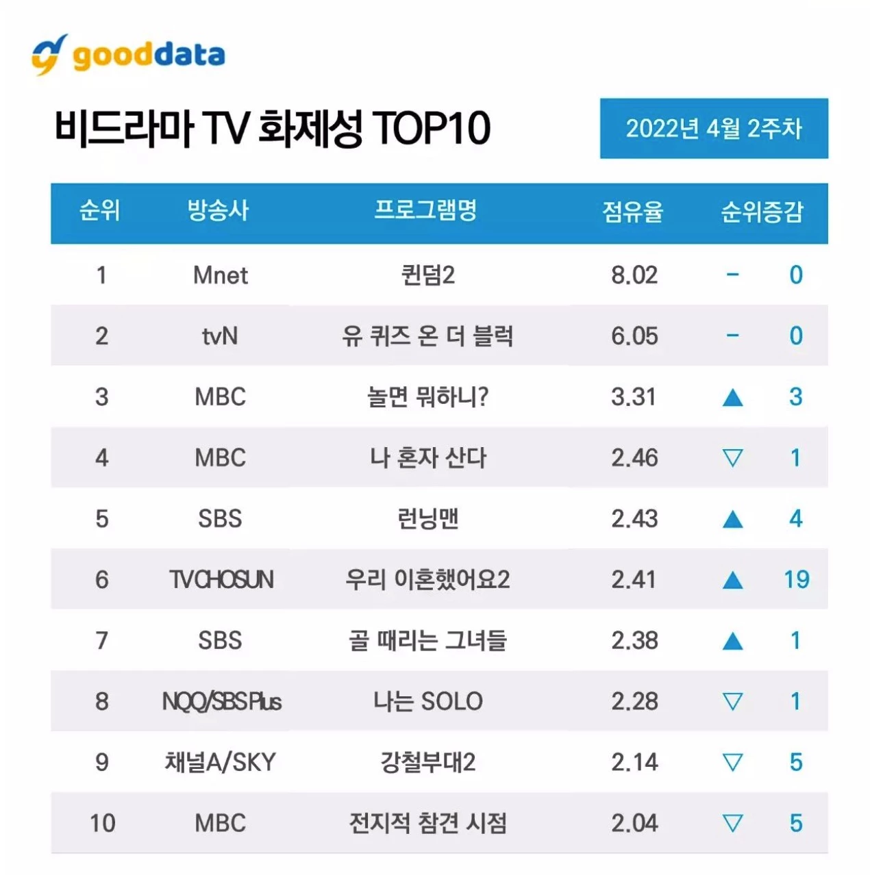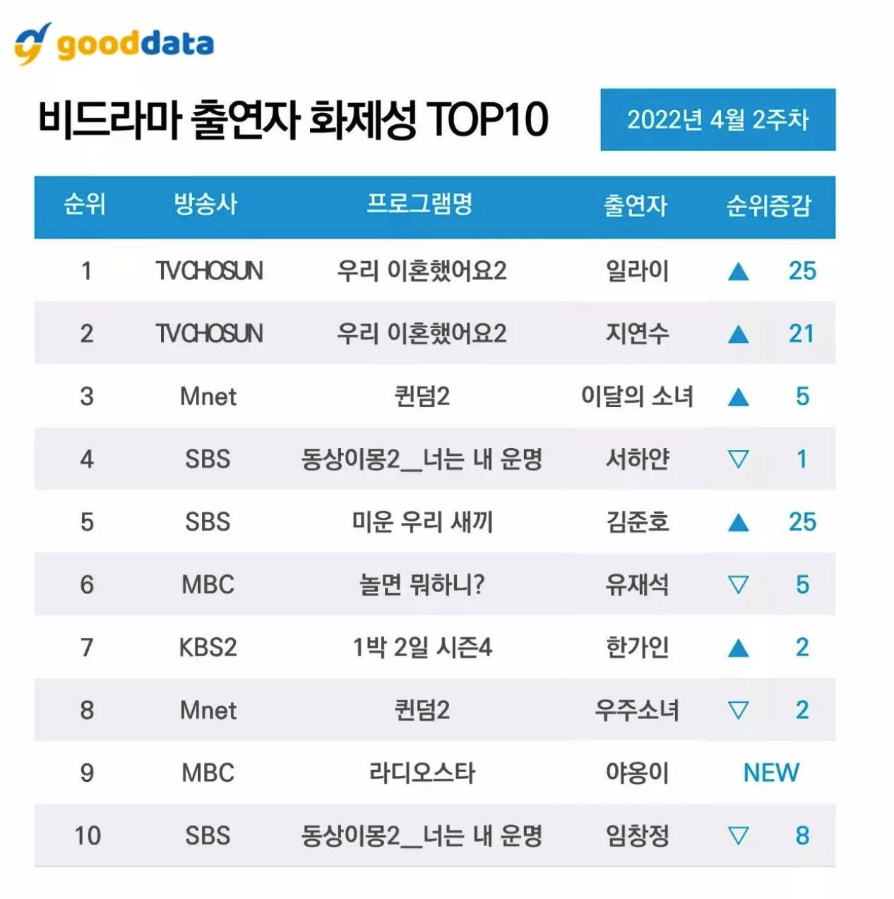 비드라마 화제성 부문에서는 ‘퀸덤 2’, ‘유 퀴즈 온 더 블럭’, ‘놀면 뭐하니’, ‘나 혼자 산다’등이 순위에 올랐다. 출연자 화제성 부분에서는 일라이, 지연수, 이달의 소녀, 서하얀 등이 순위에 올랐다.