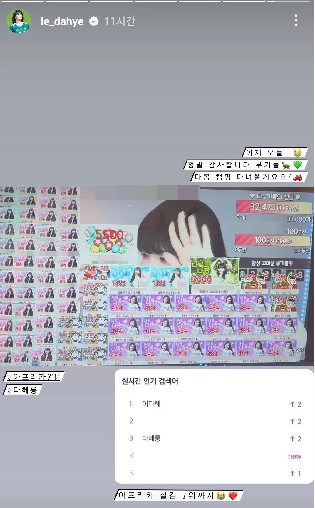 해당 게시글에는 이다혜가 자신의 인스타그램 스토리에서 "아프리카TV 실시간 검색어 1위까지. 어제오늘 정말 감사합니다 부기들"이라는 글과 함께 방송 중 공개한 별풍선 후원 내역이 캡처돼 실렸다.