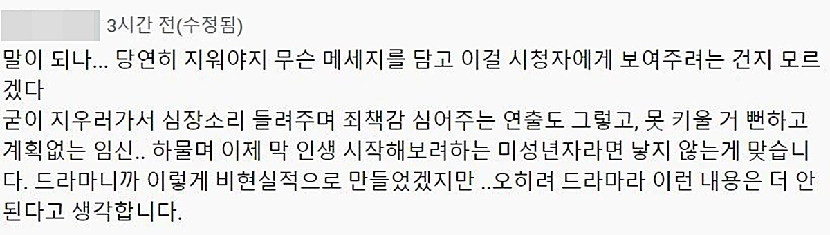 일부 시청자들은 해당 드라마가 10대의 임신과 출산을 미화한다며 불편해하고 있다.