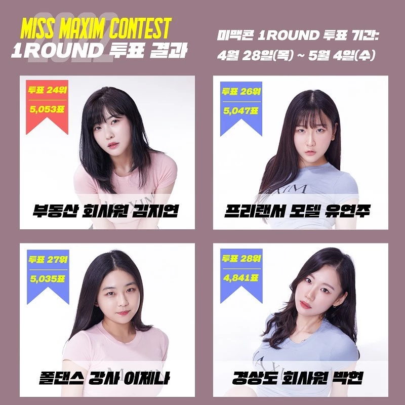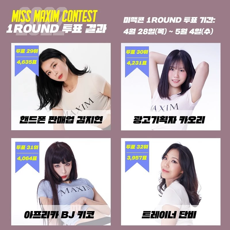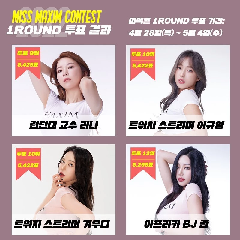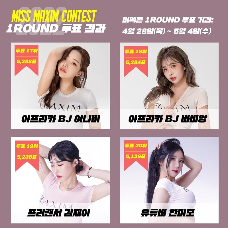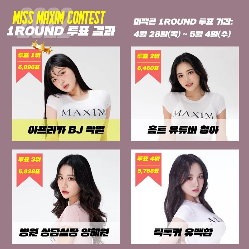 맥심은 지난달 28일부터 지난 4일까지 실시한 1라운드 투표에서 아프리카TV BJ 박별이 가장 많은 표를 얻어 1위를 차지했다고 밝혔다. 박별이 얻은 표는 6896표다. 2위는 홈트 유튜버 청아(6460표), 3위는 병원 상담실장인 양혜원이다.