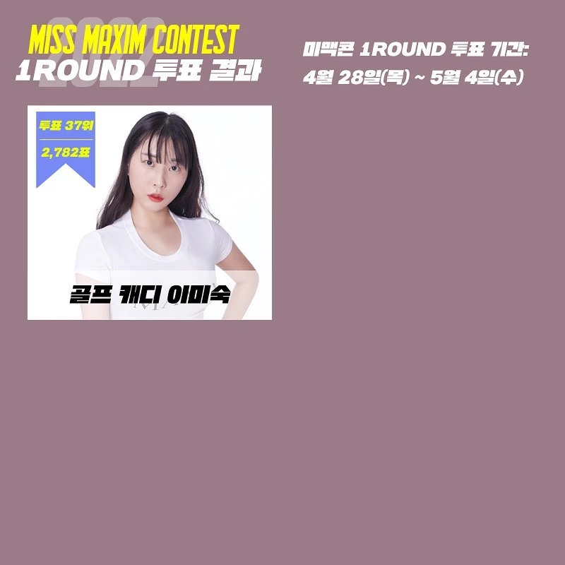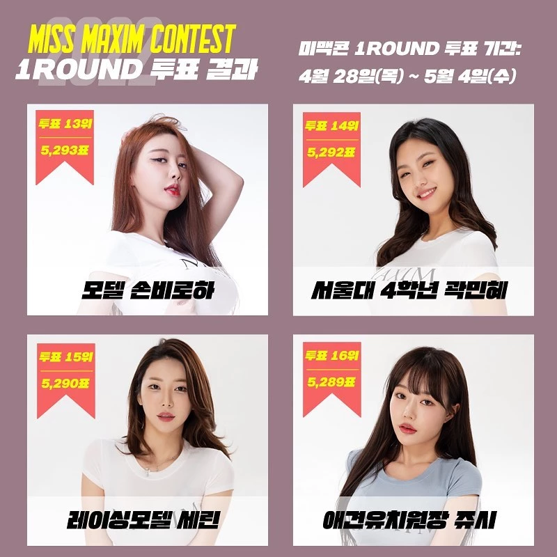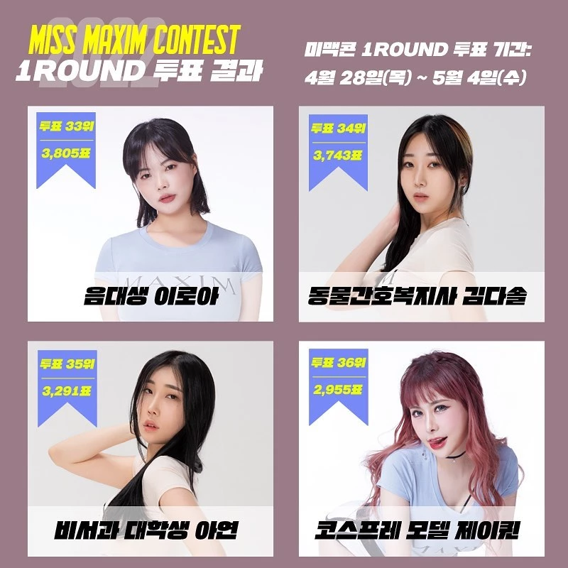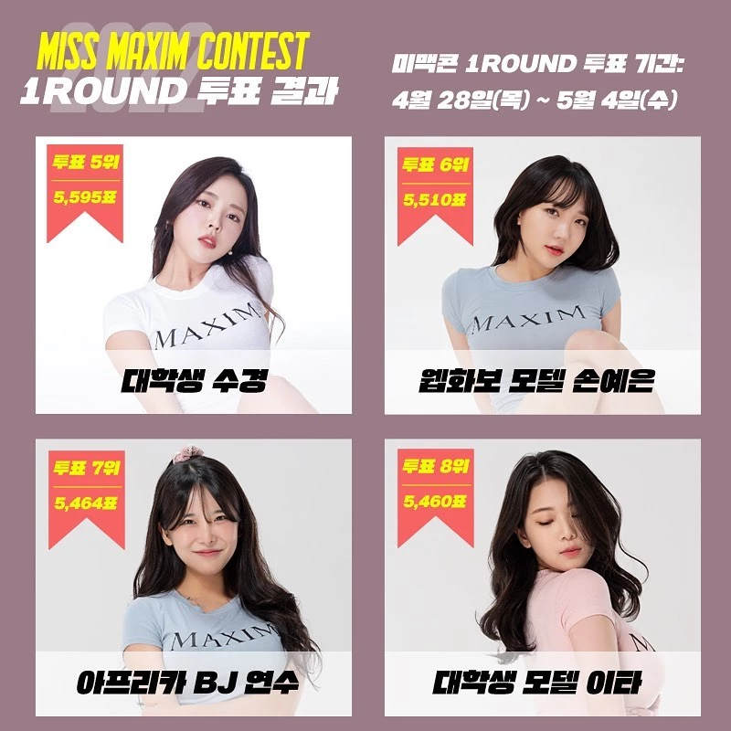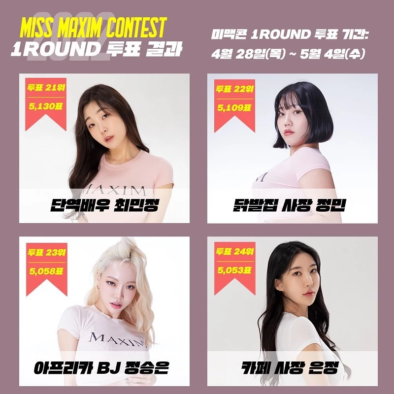 맥심은 지난달 28일부터 지난 4일까지 실시한 1라운드 투표에서 아프리카TV BJ 박별이 가장 많은 표를 얻어 1위를 차지했다고 밝혔다. 박별이 얻은 표는 6896표다. 2위는 홈트 유튜버 청아(6460표), 3위는 병원 상담실장인 양혜원이다.