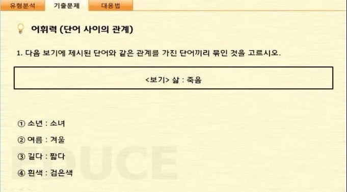 '삶 : 죽음'과 같은 관계를 가진 단어 조합을 찾는 문제였다. 어휘력 테스트다.