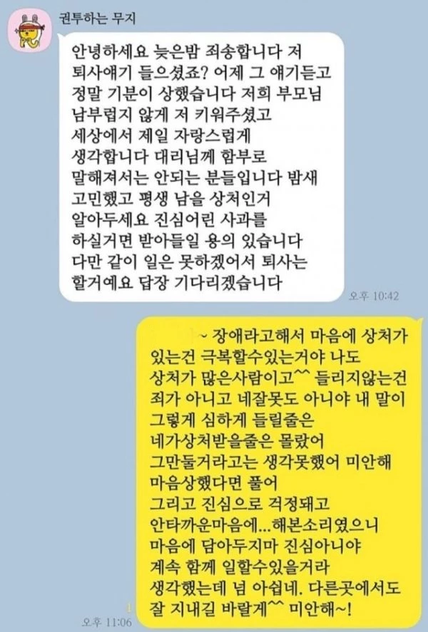 이후 작성자가 추가한 메신저 내용에 따르면 후배는 "저희 부모님은 남부럽지 않게 저 키워주셨다. 평생 남을 상처인 거 알아두라. 진심 어린 사과를 하시면 받아들이겠다. 하지만 같이 일은 못 하겠다"라고 사과를 요구했다.