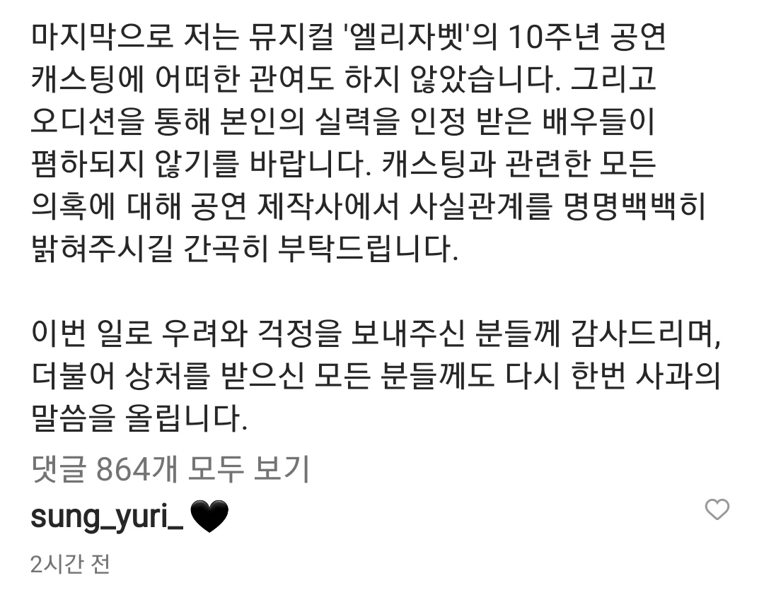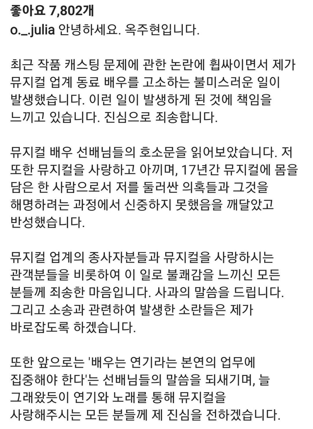 다음은 옥주현이 24일 올린 사과문 전문이다. 옥주현은 이번 일로 물의를 일으킨 점에 대해 사과했다. 다만 그는 "뮤지컬 '엘리자벳'의 10주년 공연 캐스팅에 어떠한 관여도 하지 않았다"라고 밝혔다.