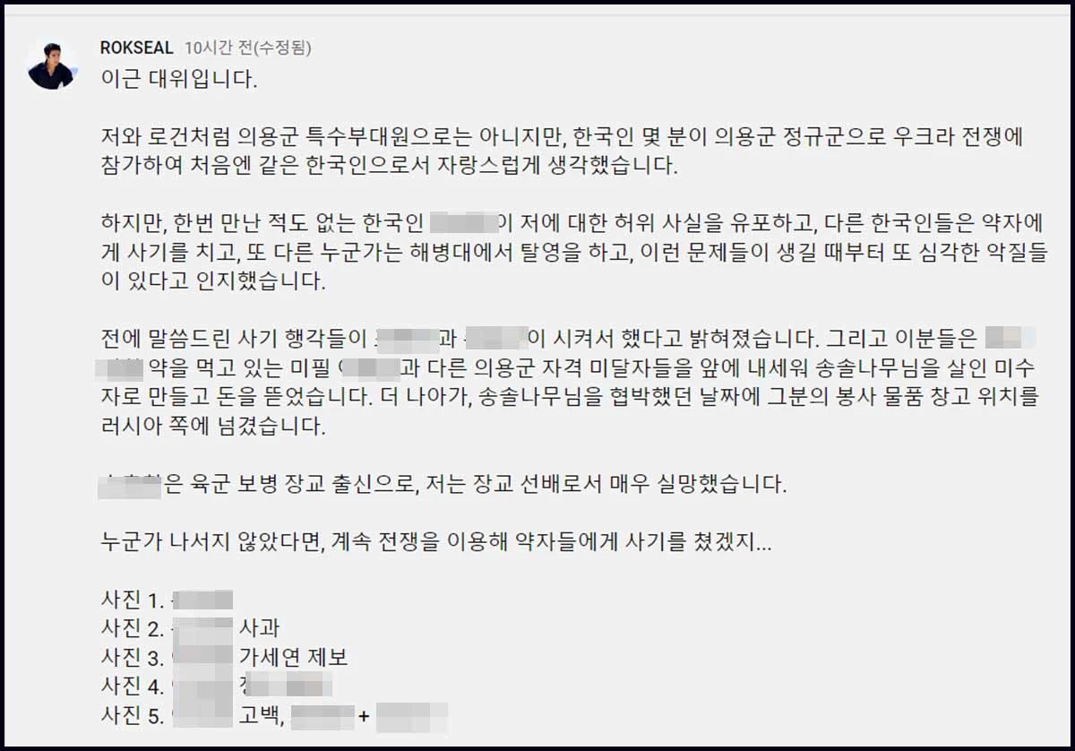 이근은 "저와 로건처럼 의용군 특수부대원으로는 아니지만 한국인 몇 분이 의용군 정규군으로 우크라이나 전쟁에 참가해 처음엔 같은 한국인으로서 자랑스럽게 생각했다"라며 “하지만 한 번 만난 적도 없는 한국인 조모씨가 저에 대한 허위 사실을 유포하고, 다른 한국인들은 약자에게 사기를 치고, 또 다른 누군가는 해병대에서 탈영했다”라고 말했다.
