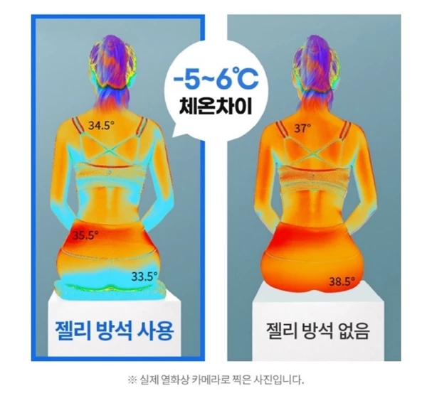 통풍과 열 방출에 최적화된 벌집 모양 구조로 열이 몰리는 엉덩이는 물론, 상체까지 시원함이 전달된다. 실제 측정 결과, 젤리 방석 사용 시 체온이 5~6°C 이상 차이 나는 모습을 보였다. 통기성에 최적화된 실리콘 100% 소재로 바람이 솔솔 통해 뽀송함과 상쾌함도 오래 유지한다.