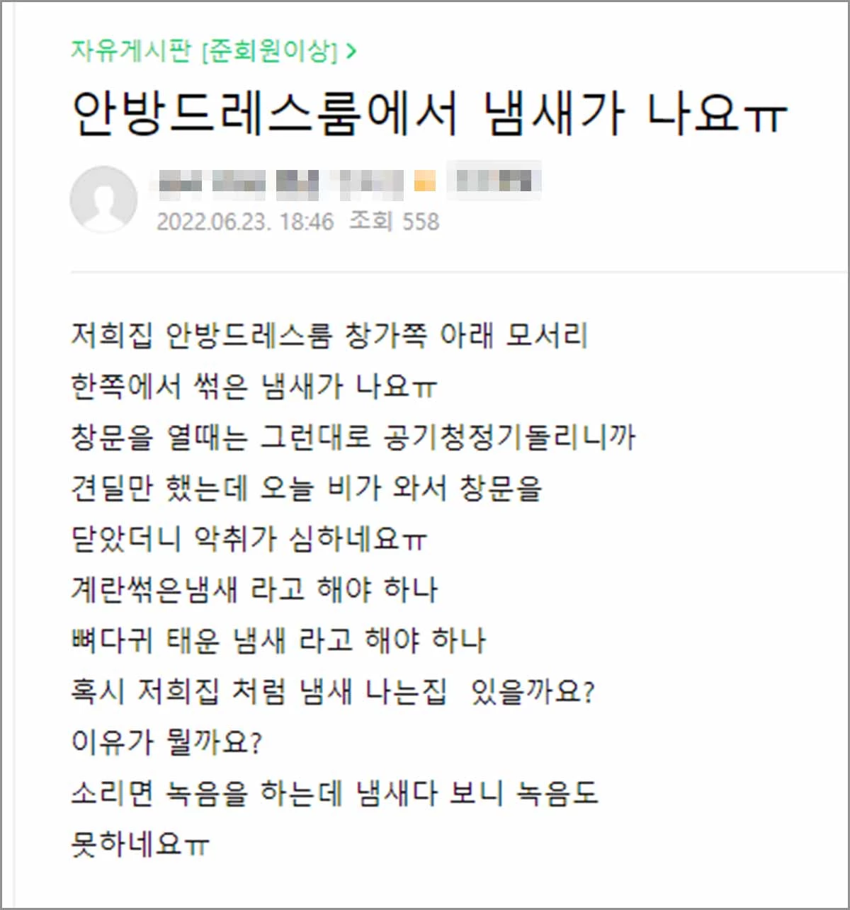 A씨는 지난달 23일 해당 카페에 ‘안방 드레스룸에서 냄새가 난다’는 글을 올려 “안방 드레스룸 에서 썩은 냄새가 난다. 창문을 열 때는 공기청정기를 돌리니까 그런대로 견딜 만했는데 비가 와서 창문을 닫았더니 악취가 심하다. 계란 썩은 냄새라고 해야 하나, 뼈다귀 태운 냄새라고 해야 하나. 혹시 우리 집처럼 냄새가 나는 집이 있나”라고 말한 바 있다.