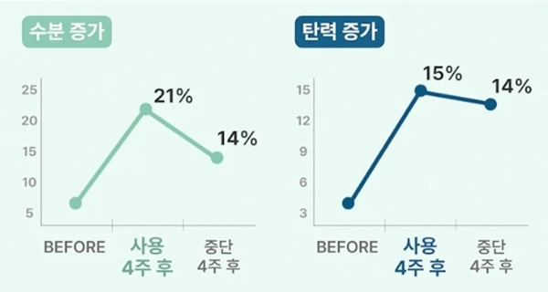 실체 측정 결과 주름 부위에 4주 사용 후 수분 21%, 탄력 15% 증가의 효과를 보였다. 심지어 사용 중단 후에도 4주 이상 보습과 탄력 효과가 지속됐다.