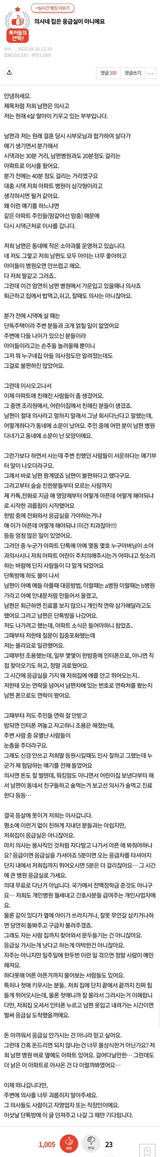 그는 "남편이 병원에서 가운 입고 있을 때나 의사지, 퇴근하고 집에서 밥 먹고 쉬고 잘 때도 의사는 아니지 않나. 우리 집이 응급실도 아니다"라고 분통을 터뜨렸다.