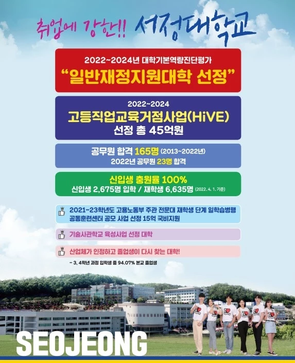 서정대학교는 ‘취업에 강한 대학’으로 공무원 165명을 배출하였고,‘최우수 국가 자격증 취득 대학’으로 12년 연속 기능장 40명을 배출하는 등 전국 최고 수준의 대학으로 성장하고 있다.