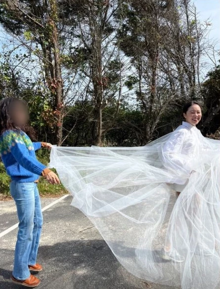 공효진은 19일 인스타그램 스토리에 웨딩드레스를 입고 야외에서 찍은 사진을 올렸다. 사진에는 공효진이 미니 셔츠 원피스 스타일의 웨딩드레스를 입고 속이 비치는 시스루 소재 드레스 자락을 흩날리고 있는 모습이 담겼다.