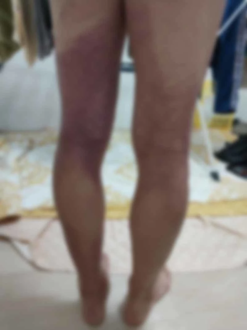 성인 남성으로 보이는 A씨의 양쪽 다리는 성한 곳이 거의 없었다. 허벅지부터 발목까지 전체에 피멍이 심하게 든 모습이다. 특히 허벅지 안쪽은 가장 압박이 심했던 듯 전면이 보라색 멍으로 물들어 있었다. 사고 당시 몸에 가해진 압박이 얼마나 극심했는지 짐작하게 한다.