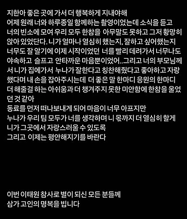그는 "어제 원래 너와 하루종일 함께하는 촬영이었는데 소식을 듣고 너의 빈소에 모여 우리 모두 한참을 아무 말도 못 하고 그저 황망히 앉아있었다"라며 "네가 얼마나 열심히 했는지, 잘하고 싶어 했는지 너무도 잘 알기에, 이제 시작이었던 너를 빨리 데려가서 너무나 야속하고 슬프고 안타까운 마음뿐이었다"라며 비통한 마음을 표현했다.