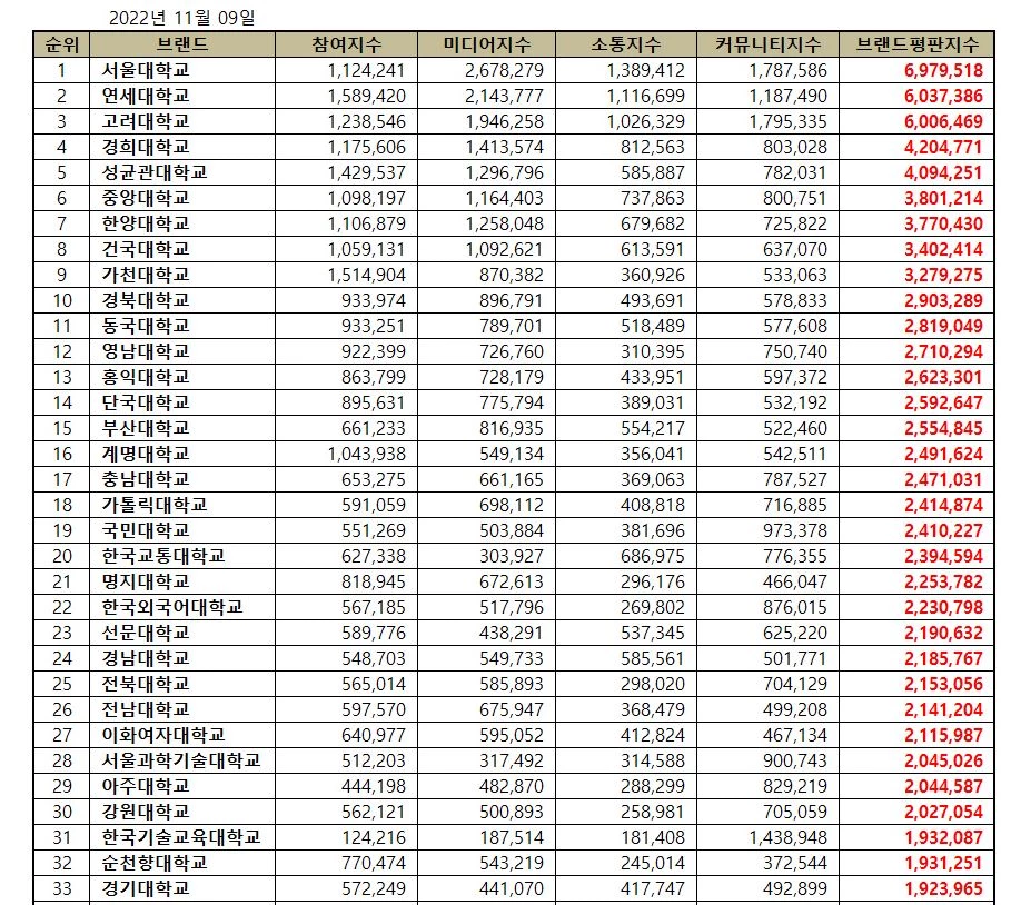 11월 대학교 브랜드평판 상위 30위에는 서울대학교, 연세대학교, 고려대학교, 경희대학교, 성균관대학교, 중앙대학교, 한양대학교, 건국대학교, 가천대학교, 경북대학교, 동국대학교, 영남대학교, 홍익대학교, 단국대학교, 부산대학교, 계명대학교, 충남대학교, 가톨릭대학교, 국민대학교, 한국교통대학교, 명지대학교, 한국외국어대학교, 선문대학교, 경남대학교, 전북대학교, 전남대학교, 이화여자대학교, 서울과학기술대학교, 아주대학교, 강원대학교가 이름을 올렸다.