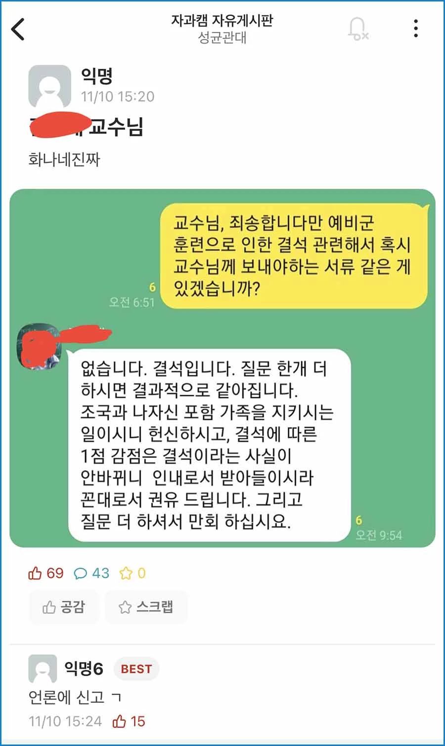 “없습니다. 결석입니다. 질문 한 개 더 하면 결과적으로 같아집니다. 조국과 나, 가족을 지키는 일이니 헌신하시고 결석에 따른 1점 감점은 결석이라는 사실이 안 바뀌니 인내로 받아들이라고 ‘꼰대’로서 권유합니다. 그리고 질문 더 하셔서 만회하십시오.”