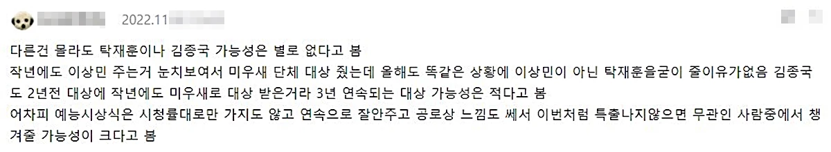글쓴이는 올해 SBS 연예대상의 대상 수상자와 관련해 "다른 건 몰라도 탁재훈이나 김종국 가능성은 별로 없다고 본다"라고 예상했다.