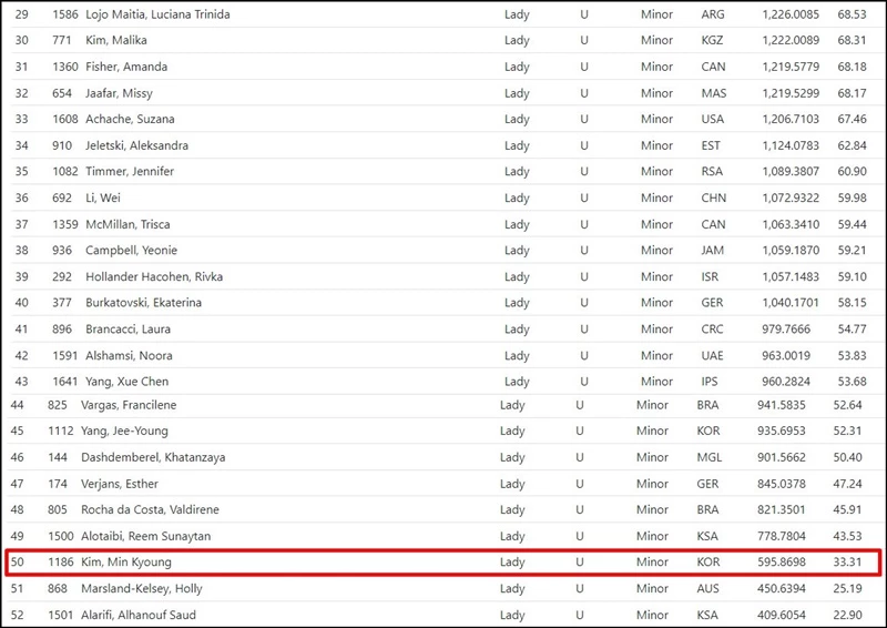 하지만 이 순위는 곧바로 뒤집혔다. 2일 기준 공식 홈페이지 '2022 국제실용사격연맹 핸드건 월드 슛'에서 확인된 결과에는 김민경의 이름이 52명 중 50위, 341명 중 324위에 올라와 있다.