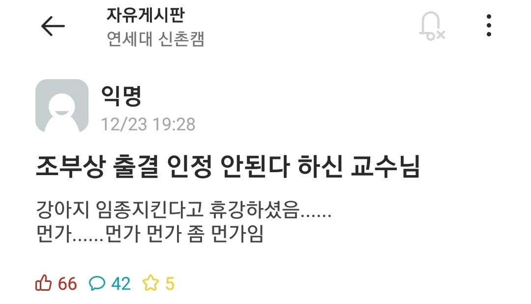 “조부상 출결 인정 안 한 교수, 강아지 임종 지킨다고 휴강” (feat. 연세대)
