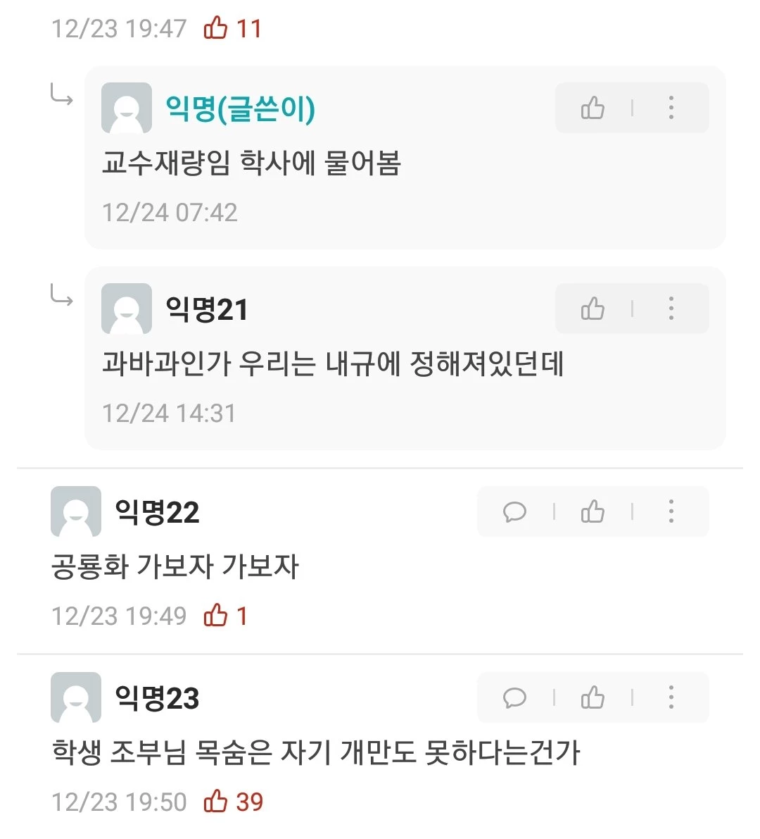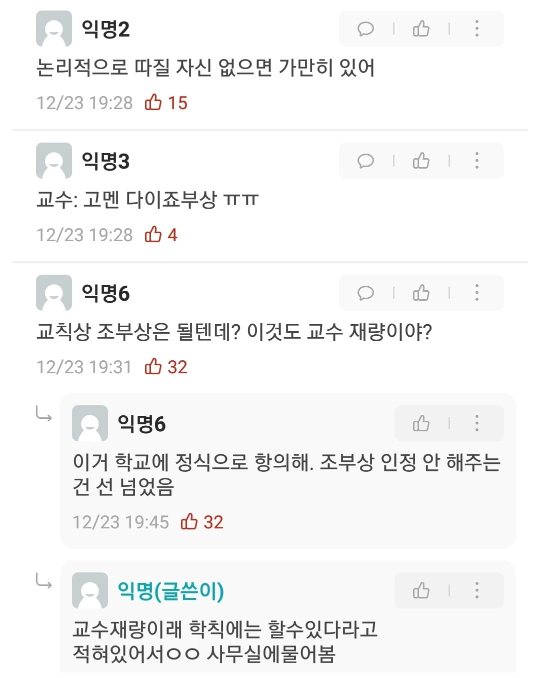 "말이 안 된다", "미쳤다", "학생 조부님 목숨은 자기 개만도 못하다는 건가", "공론화 가보자" 등 격앙된 의견이 쏟아졌다.