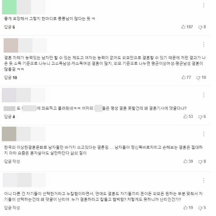 보고서에는 고소득 남녀 간의 결혼보다 고소득 남성과 비취업·저소득 여성 간 결혼, 저소득·비취업 남성과 중위소득 이상 여성 간 결혼 등 소득 수준이 차이 나는 남녀의 결혼이 주요국에 비해 상대적으로 빈번히 일어나고 있기 때문이라는 내용이 담겨 있다.