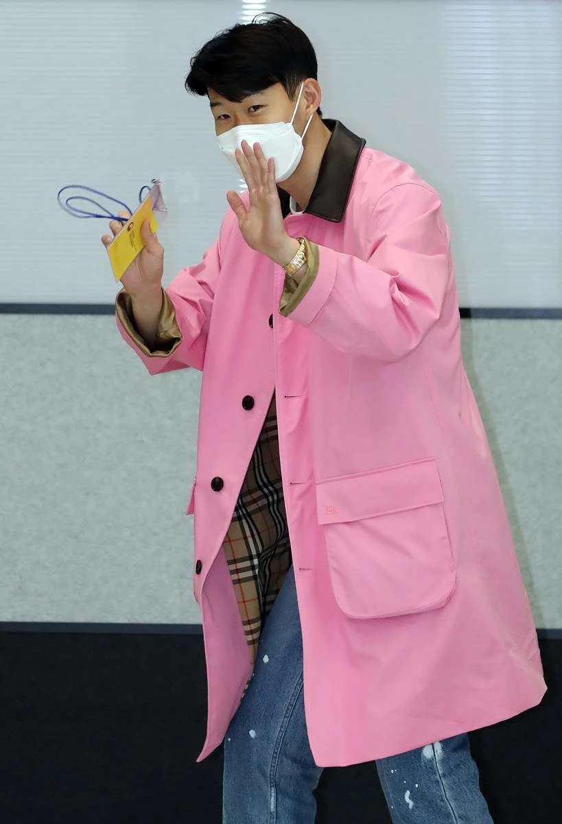 이날 손흥민은 흰 티셔츠에 청바지, 운동화로 나이에 걸맞은 캐주얼한 패션을 선보였다. 핑크 컬러 트렌치코트가 단연 눈에 띈다. 슈프림과 버버리가 협업해 만든 제품으로 화제를 모았다.