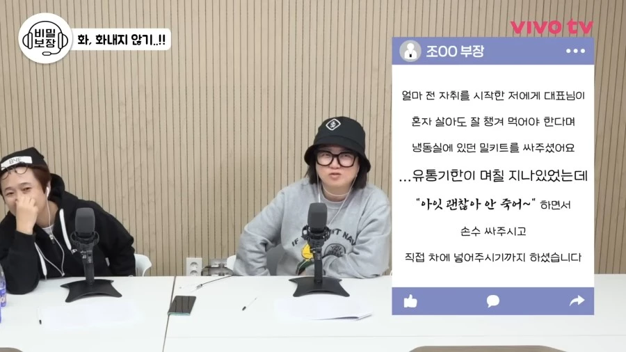이에 따르면, 직원은 "얼마 전 자취를 시작한 제게 대표님(송은이)이 '혼자 살아도 잘 챙겨 먹어야 한다'면서 냉동실에 있던 밀키트를 꺼내주셨다. 유통기한 며칠 지났는데 '괜찮아. 안 죽어'라고 손수 싸주시고 직접 차에 넣어주셨다. 직원들 굶을까 봐 신경 써주는 대표님께 감사하다"고 말했다.