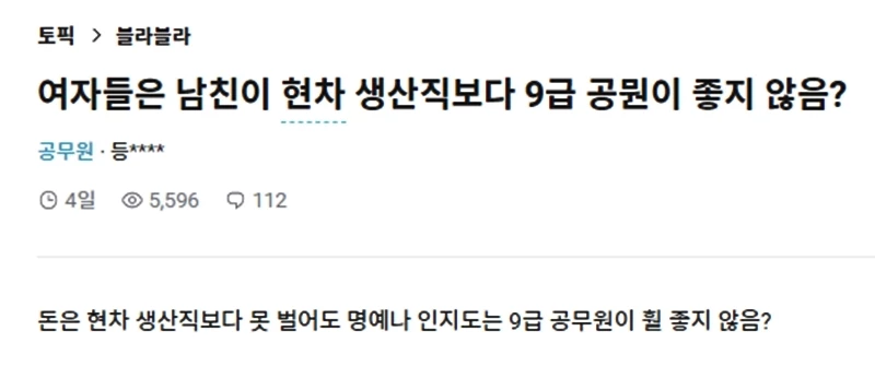 A씨는 최근 직장인 익명 커뮤니티 블라인드에 "여자들은 남친 직업이 현대차 생산직인 것보다 9급 공무원인 게 더 좋지 않냐"고 질문했다.