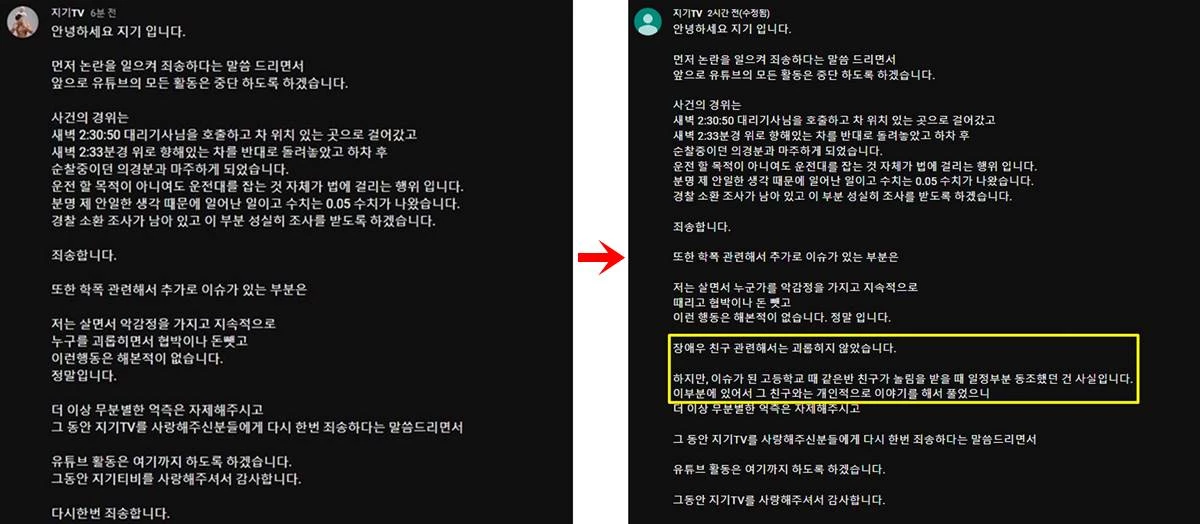 지기는 음주운전, 학폭 논란에 대한 입장문을 내놓으며 "그동안 지기TV를 사랑해 주신 분들에게 다시 한번 죄송하다는 말씀드린다. 유튜브 활동은 여기까지 하도록 하겠다. 그동안 지기TV를 사랑해 주셔서 감사하다. 다시 한번 죄송하다"라며 재차 고개를 숙였다.