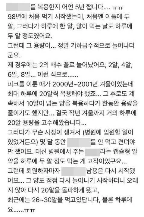 그는 "피크를 이룬 때에는 최대 하루에 20알씩 복용했다. 그 후로도 계속 10알이 넘는 양을 복용하다가 한동안 용량을 줄이기도 했다"고 밝혔다.
