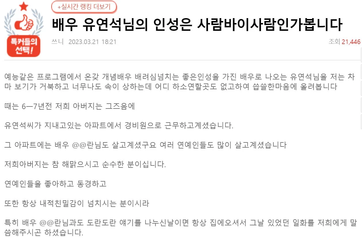 이어 그는 "때는 6~7년 전으로 저희 아버지가 그즈음에 유연석 씨가 지내고 있는 아파트에서 경비원으로 근무하고 계셨다"며 당시 해당 아파트에는 배우 라미란 님과 함께 여러 연예인 분들이 많이 살고 계셨다고 알렸다.